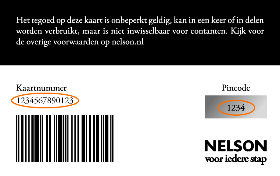 De Nelson cadeaukaart koop je in één van onze ruim 100 Nelson winkels en het bedrag is zelf te bepalen. De cadeaukaart is onbeperkt geldig, in te leveren bij alle Nelson winkels én op Nelson.nl. Het tegoed op de cadeaukaart kan in een keer of in delen worden besteed, maar is niet inwisselbaar voor contanten.